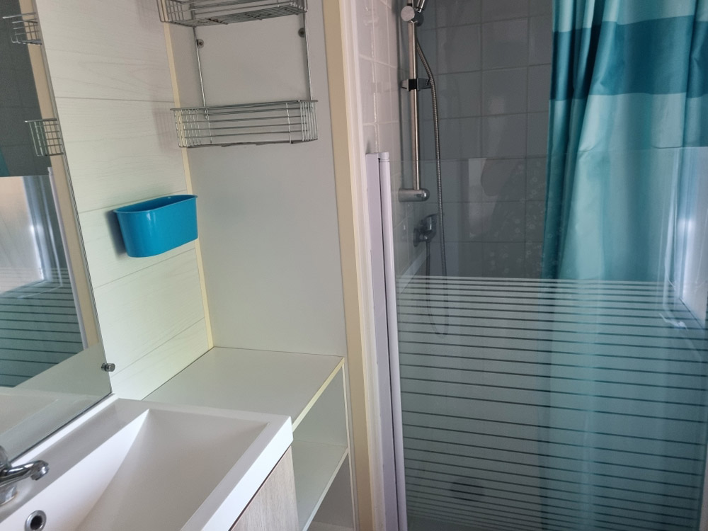 - 1 chambre avec 1 lit double (140×190) et accès direct à la salle d’eau